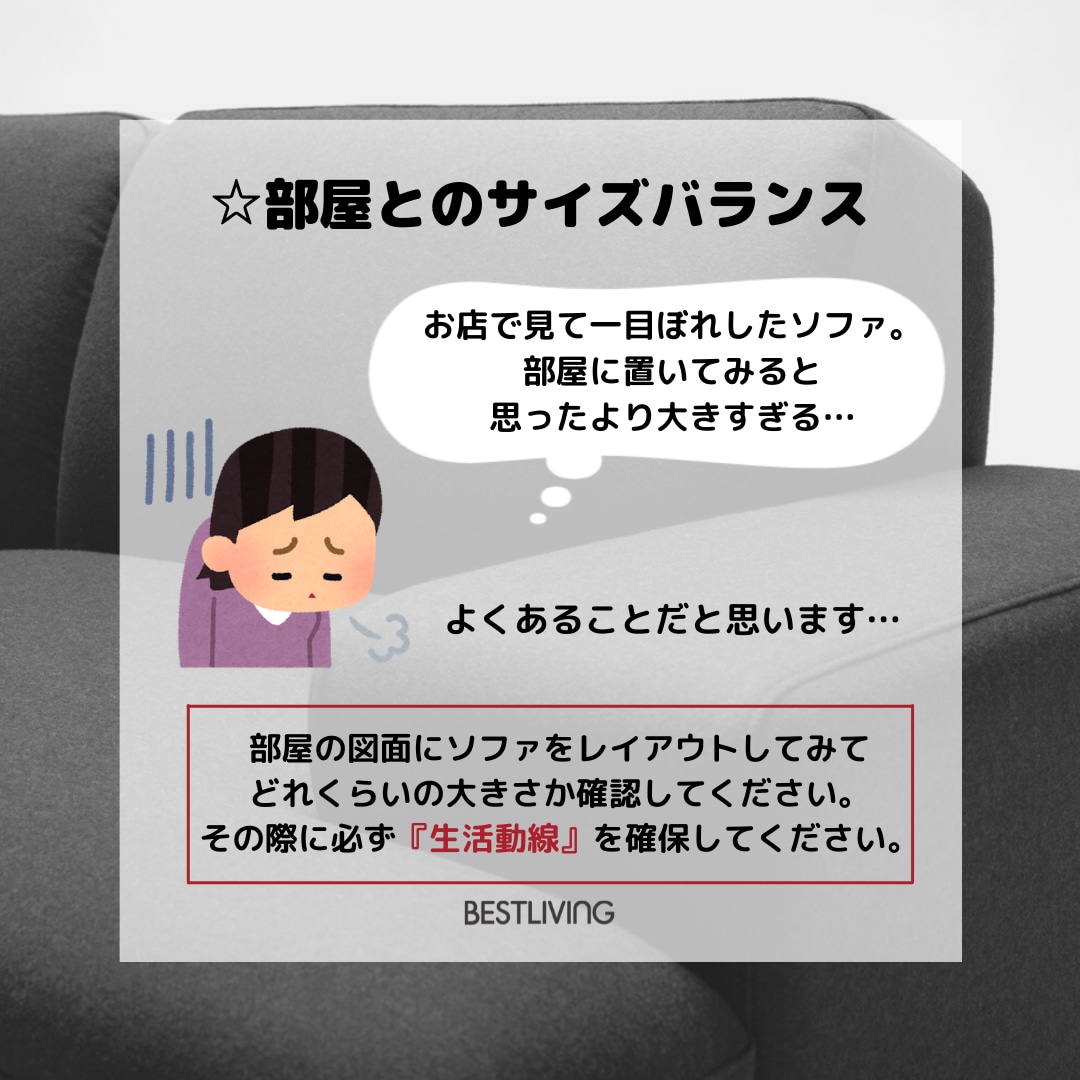 ソファと壁、他の家具とのスペースに注意しましょう。